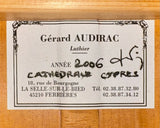Fabriquée en 2006, ce modèle Cathédrale Cyprès (Flamenca) bénéficie de l'aboutissement de décennies de recherches et de perfectionnements de la construction de guitare de la part de Gérard Audirac.