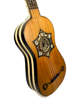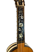 Issue de l’évolution de la vihuela espagnole et des premières guitares Renaissance, elle adopte la configuration à cinq chœurs de cordes doubles et développe un langage musical riche mêlant rasgueado rythmique et jeu polyphonique délicat.
