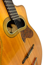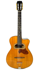 Ainsi, est ici proposé à la vente un superbe modèle de guitare manouche grande bouche à pan coupé, avec 12 cases hors caisse, fabriqué par Louis Patenotte à Mirecourt dans les années 1950.