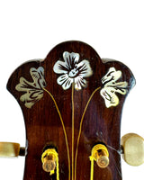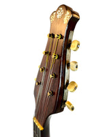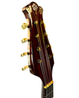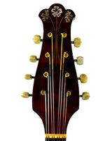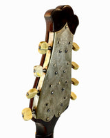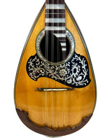 Cette mandoline de soliste, réalisée dans la plus pure tradition napolitaine, se distingue par un superbe palissandre travaillé en côtes creuses, une table en épicéa aux veines très resserrées, ainsi qu’une plaque en écaille sur feuille d’or, richement ornée d’entrelacs de nacre.