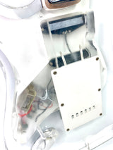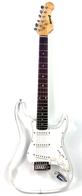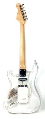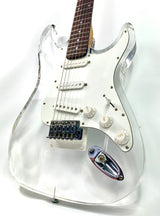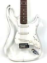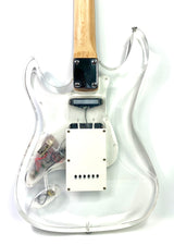 Atypical transparent Stratocaster guitar from the Infinity brand.