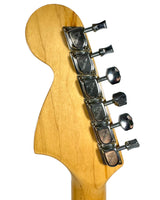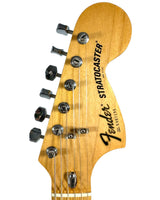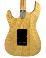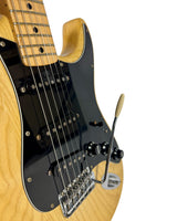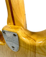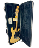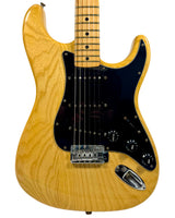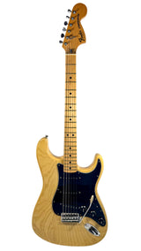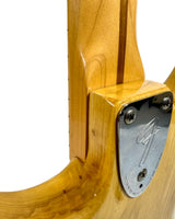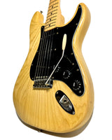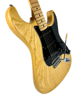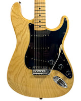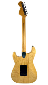 Typiquement « CBS », cette Fender Stratocaster Natural (refin) de 1979 offre un corps en frêne blond sous un vernis transparent refait, associé au fameux manche érable à grosse tête et plaque 3-vis et bullet truss-rod de l’époque.