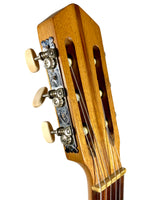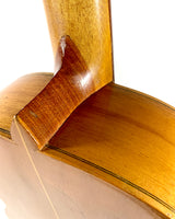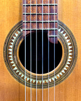 Dans le plus pure caractère de la lutherie traditionnelle espagnole de Valence et particulièrement de l'école de Salvador Ibanez, cette guitare reprend le style de rosace de ce dernier.