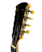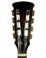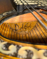 Cette magnifique mandoline de 1925, portant le numéro 464, est entièrement d'origine et signée à l'intérieur. Elle représente le modèle intermédiaire / haut de gamme, dotée de renforts, d'un vernis intérieur, d'une plaque de protection en écaille finement ouvragée dans un style parchemin, d'un chevalet compensé en ébène avec sillet en os, ainsi que d'une belle table en épicéa.