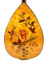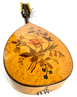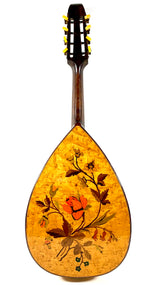 Voici ici à la vente une très belle mandoline plate de concert fabriquée par l'atelier René Gérome, avec un joli fond décoré en marqueterie de bois à motifs floraux, datée des années 1940.