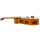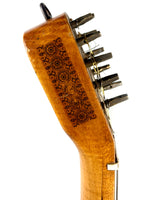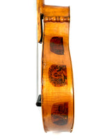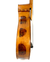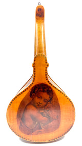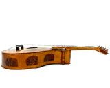 Il possède une caisse aux extrémités (niveau chevalet) plus larges, en forme de poire. De plus la tête présente un cheviller spécifique avec des chevilles en métal, s'accordant avec une clef, comme on peut le retrouver sur les harpes ou cithares. Mais l'un de ces signes le plus distinctifs est le fait qu'il possède un décors de décalcomanies représentant des sujets à fleurs ou des scènes de genre sur la table et les éclisses. Le fond est généralement orné d'une décalcomanie couvrant toute la surface représentant un portrait.