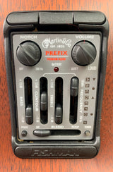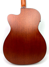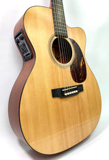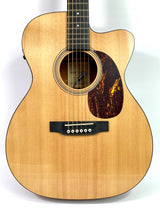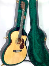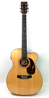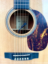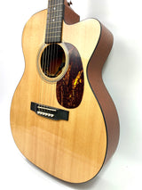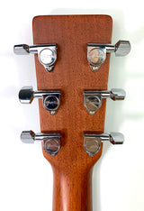 New Old Stock. The back, sides and neck are made of mahogany. The top is spruce, the fingerboard and bridge are micarta. It has black fillets around the body, and a herringbone rosette decoration. The neck has 20 frets. The top is natural colored and glossy finish while the rest of the guitar is natural satin finish. The tuners are chrome Martin with small buttons. The protection plate is tortoiseshell in color. Electronics: Fhisman Premium blend preamp. It has a volume control, a three-band equalizer, a filter for bass and another for treble. There is also a tuner and a button for mixing the two microphones (one under the bridge and one overhead in the soundhole). The two microphones can be used in stereo or not.